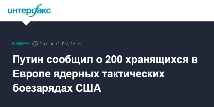 "В Европе, у американцев хранится 200 ядерных тактических боезапасов, в основном это атомные бомбы в шести европейских странах-членах Северо-Атлантического блока НАТО. Для их возможного применения подготовлено 257 самолетов и не только американских, но этих упомянутых мною стран в Европе", - сказал он в ходе переговоров с белорусским коллегой Александром Лукашенко в Петербурге.