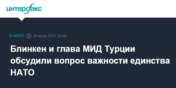"Госсекретарь Блинкен и министр иностранных дел Чавушоглу обсудили важность единства НАТО в преддверии саммита альянса, который состоится 29-30 июня в Мадриде", - говорится в сообщении.