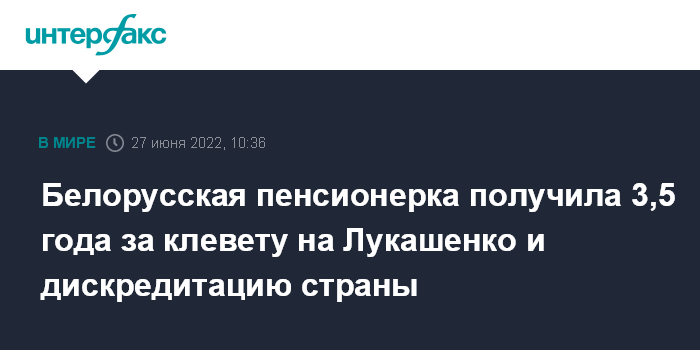 Москва. 27 июня. INTERFAX.RU - Три с половиной года лишения свободы и штраф получила 65-летняя пенсионерка из Брестской области Белоруссии за клевету на главу государства и дискредитацию страны, сообщили в Генпрокуратуре республики в понедельник.