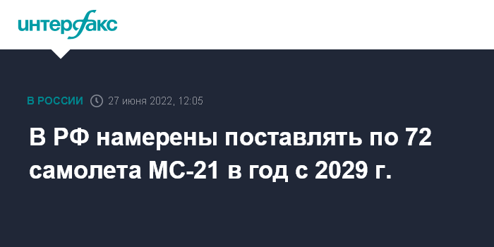 Москва. 27 июня. INTERFAX.RU - РФ планирует поставлять заказчикам по 72 пассажирских самолета МС-21 в год, начиная с 2029 года, сообщил вице-премьер РФ Юрий Борисов в ходе совещания главы правительства Михаила Мишустина с вице-премьерами в понедельник.
