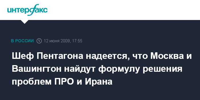 Москва. 12 июня. INTERFAX.RU - Министр обороны США Роберт Гейтс выразил надежду, что Америка и Россия найдут взаимоприемлемые решения проблем международной безопасности, в том числе вопросов ПРО и Ирана.