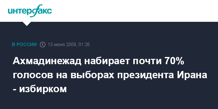 По данным избиркома, М.Ахмадинежад набирает 69% голосов, у его ближайшего соперника, бывшего премьер Ирана Мира Хоссейна Мусави пока 28% голосов.
