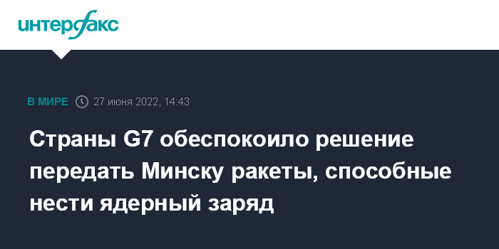 Москва. 27 июня. INTERFAX.RU - Страны "Большой семерки" встревожены информацией о том, что Россия может предоставить Белоруссии ракеты, которые могут оснащаться ядерным боезарядом, говорится в заявлении лидеров G7 по итогам.