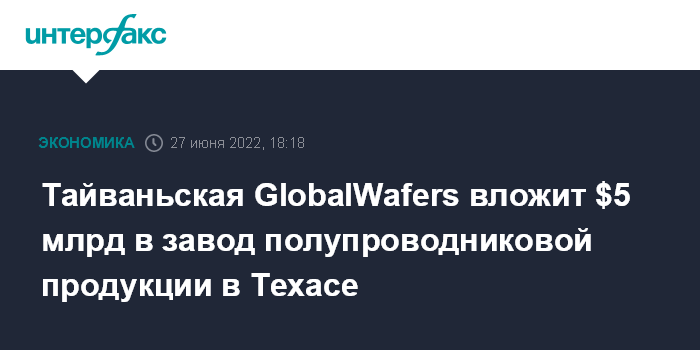 Москва. 27 июня. INTERFAX.RU - Тайваньская GlobalWafers планирует инвестировать $5 млрд в строительство завода в американском штате Техас.
