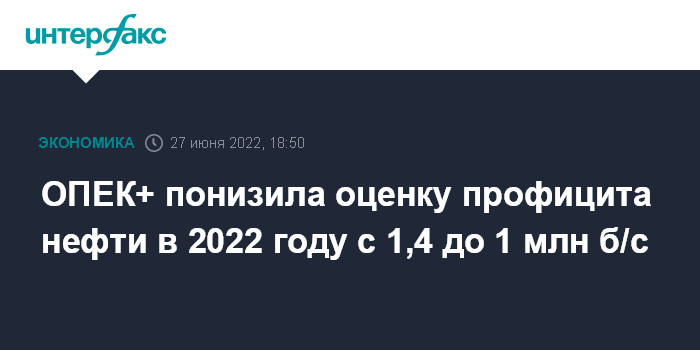 Москва. 27 июня. INTERFAX.RU - Эксперты ОПЕК+ снизили оценку профицита нефти на мировом рынке по базовому сценарию в 2022 году с 1,4 млн баррелей в сутки, предполагавшихся месяц назад, до 1 млн б/с, говорится в отчетности технического комитета альянса, с которой ознакомился "Интерфакс".