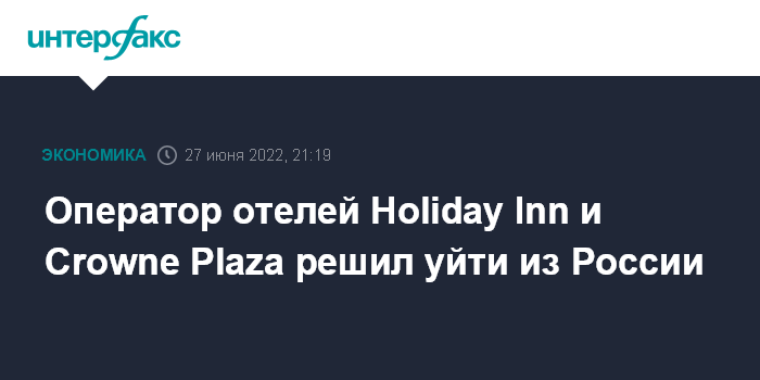 Москва. 27 июня. INTERFAX.RU - Британская компания InterContinental Hotels Group (IHG), управляющая гостиничными брендами Holiday Inn, Indigo, Crownе Plaza и другими, объявила о прекращении деятельности в России.