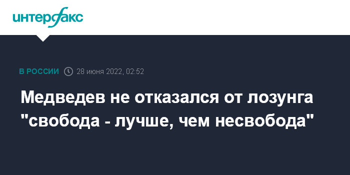 В интервью газете "Аргументы и факты" Медведев ответил на вопрос, как он сейчас относится к лозунгу "свобода - лучше, чем несвобода", который стал лейтмотивом его президентства.