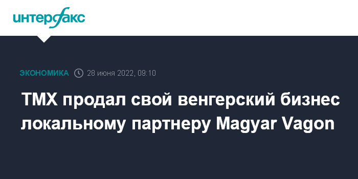 Москва. 28 июня. INTERFAX.RU - АО "Трансмашхолдинг" (ТМХ) продало свой бизнес в Венгрии локальному партнеру Magyar Vagon Zrt, пишут во вторник "Ведомости" со ссылкой на гендиректора холдинга Кирилла Липу.