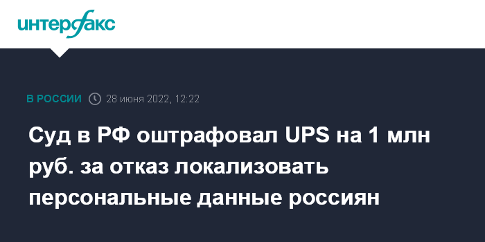 Москва. 28 июня. INTERFAX.RU - Мировой суд Таганского района Москвы признал виновной одну из крупнейших в мире служб экспресс-доставки, американскую логистическую компанию United Parcel Service (UPS) в правонарушении, выразившемся в отказе локализовать персональные данные россиян на территории России, передает корреспондент "Интерфакса" из зала суда во вторник.