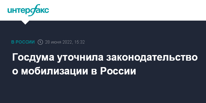 Москва. 28 июня. INTERFAX.RU - Законодательство о мобилизации в РФ получило уточнение в виде поправок о том, что президент и правительство своими нормативными актами будут определять комплекс мероприятий при объявлении общей или частичной мобилизации в стране.