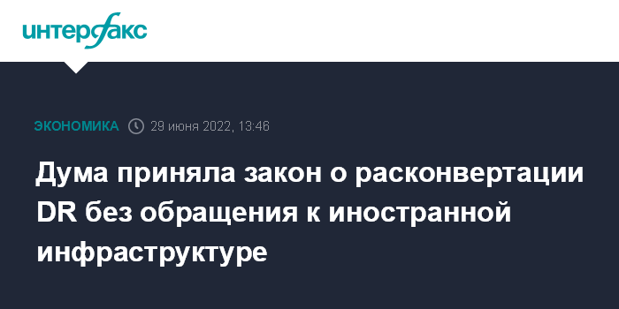 Москва. 29 июня. INTERFAX.RU - Госдума приняла в третьем чтении закон, позволяющий проводить расконвертацию депозитарных расписок (DR), действия с которыми заблокированы из-за санкций, в автоматическом или принудительном порядке в зависимости от того, где учитываются права на DR - в российском либо иностранном депозитарии.