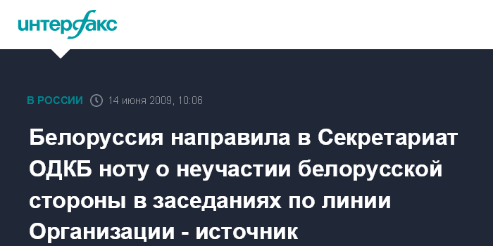 Минск. 14 июня. INTERFAX.RU - Белоруссия в воскресенье направила в Секретариат Организации Договора о коллективной безопасности ноту, в которой сообщается о неучастии белорусской делегации в заседаниях в рамках ОДКБ, сообщил агентству "Интерфакс-Запад" источник в администрации президента Белоруссии.