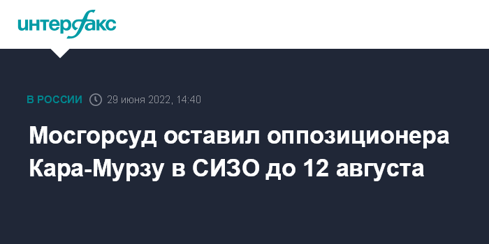 Москва. 29 июня. INTERFAX.RU - Московский городской суд отказал в удовлетворении апелляционной жалобы на продление срока содержания под стражей оппозиционера Владимира Кара-Мурзы (признан в РФ физлицом-иноагентом), арестованного по обвинению в распространении заведомо ложной информации об использовании вооруженных сил РФ.