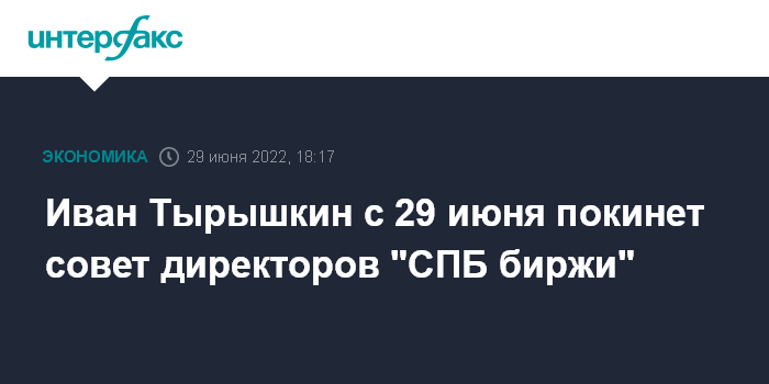 "Иван Тырышкин принял решение выйти из состава совета директоров "СПБ биржи", в котором с 16 марта 2022 занимал пост председателя. Решение вступает в силу 29 июня 2022 года", - говорится в сообщении.