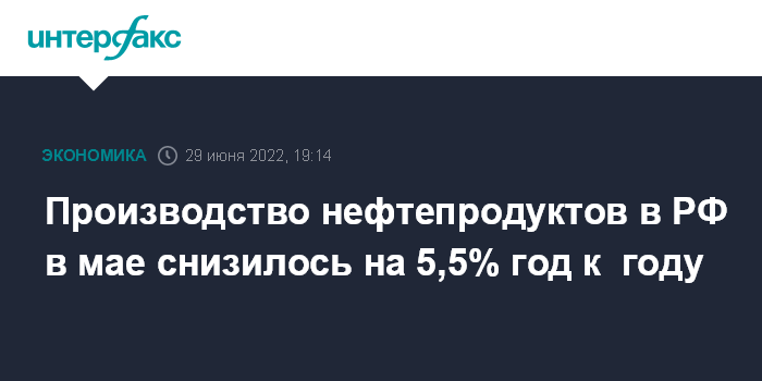 Москва. 29 июня. INTERFAX.RU - Производство кокса и нефтепродуктов в России в мае по сравнению с аналогичным месяцем прошлого года снизилось на 5,5%, в январе-мае - на 1,3%, говорится в материалах Росстата.