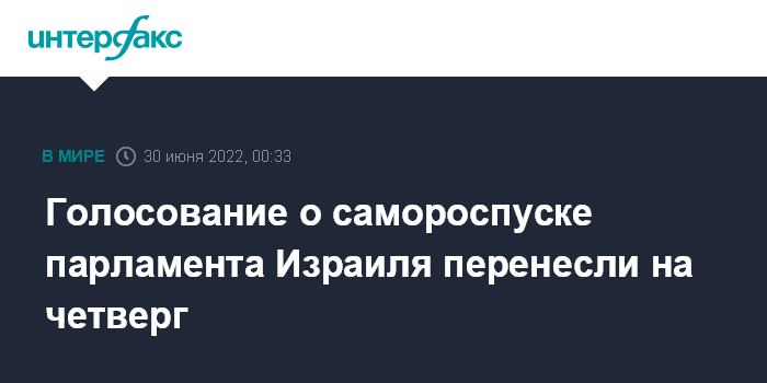 Москва. 30 июня. INTERFAX.RU - Голосование в израильском Кнессете - однопалатном парламенте - по законопроекту о самороспуске и проведении новых выборов не состоится в среду, как было запланировано; оно переносится на четверг 30 июня, сообщает Times of Israel.