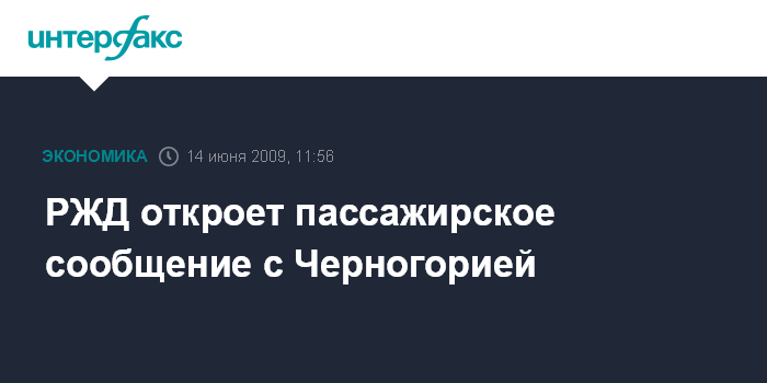 Москва. 14 июня. INTERFAX.RU - ОАО "Российские железные дороги" (РЖД) откроет пассажирское сообщение с Черногорией, сообщила пресс-служба РЖД.