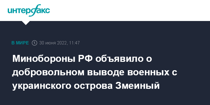 Москва. 30 июня. INTERFAX.RU - Российские военные выведены с острова Змеиный как демонстрация того, что Россия не препятствует вывозу с Украины зерна и сельхозпродукции, заявил официальный представитель Минобороны РФ Игорь Конашенков.