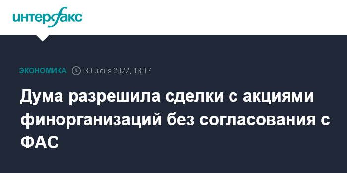 Москва. 30 июня. INTERFAX.RU - Принятый Госдумой в третьем чтении правительственный законопроект № 127020-8 разрешает в 2022 году совершать сделки с акциями, долями финансовых организаций, вне зависимости от размера их активов, без предварительного согласования с Федеральной антимонопольной службой.