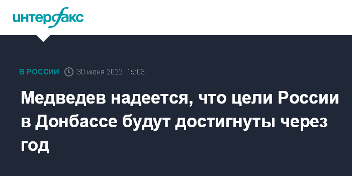 Москва. 30 июня. INTERFAX.RU - Замглавы Совбеза РФ Дмитрий Медведев рассчитывает, что через год, к следующему Санкт-Петербургскому международному юридическому форуму цели, поставленные Россией в Донбассе, уже будут достигнуты.