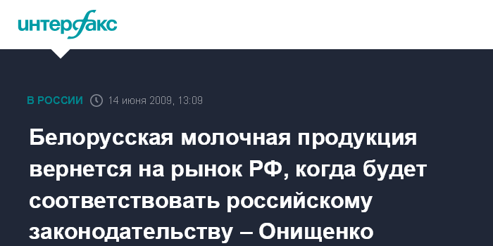 Москва. 14 июня. INTERFAX.RU - Молочная продукция из Белоруссии вернется на российский рынок после того, как будет оформлена документация, соответствующая российскому законодательству, сообщил руководитель Роспотребнадзора, главный государственный санитарный врач РФ Геннадий Онищенко.