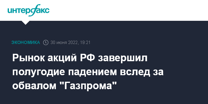 Москва. 30 июня. INTERFAX.RU - Рынок акций РФ в четверг упал вслед за обвалившимися бумагами "Газпрома" (-30,5%), акционеры которого решили не выплачивать рекордные дивиденды за 2021 год; эти негативные новости финализировали общее падение рынка с начала года из-за антироссийских санкций Запада в связи с военной операцией России на Украине.