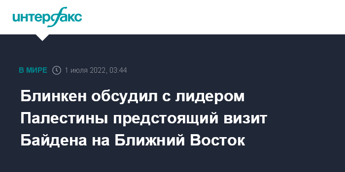 Москва. 1 июля. INTERFAX.RU - Госсекретарь США Энтони Блинкен в телефонной беседе с лидером Палестины Махмудом Аббасом обсудил вопросы, касающиеся намеченного на июль визита президента США Джо Байдена на Ближний Восток, сообщил американский госдепартамент.