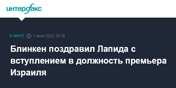 "Я с нетерпением жду продолжения тесного сотрудничества с премьер-министром Лапидом в целях укрепления всех аспектов прочного американо-израильского партнерства и противодействия общим угрозам", - говорится в сообщении Госдепа.