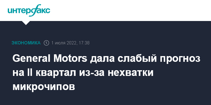Москва. 1 июля. INTERFAX.RU - Американский автопроизводитель General Motors Co. (GM) разочаровал инвесторов своим прогнозом прибыли на второй квартал текущего года на фоне нехватки полупроводниковых компонентов.