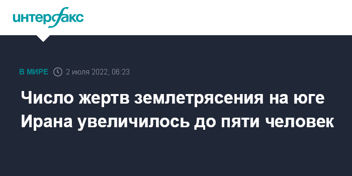 Москва. 2 июля. INTERFAX.RU - Пять человек, по предварительным данным, стали жертвами землетрясения на юге Ирана, еще 44 пострадали, сообщают местные СМИ со ссылками на власти.