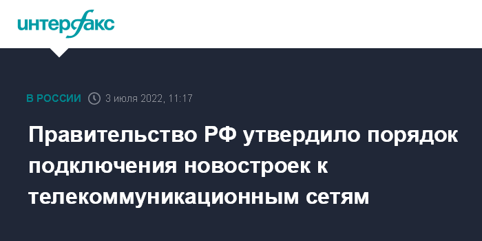 Москва. 3 июля. INTERFAX.RU - Премьер-министр России Михаил Мишустин подписал постановление, утверждающее правила технологического подключения квартир в новостройках к телекоммуникационным сетям.