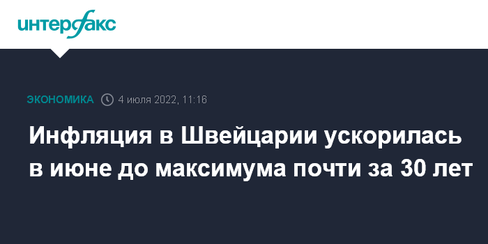 Москва. 4 июля. INTERFAX.RU - Темпы роста потребительских цен в Швейцарии в июне усилились до 3,4% в годовом выражении с 2,9% в мае, инфляция обновила максимум с 1993 года, свидетельствуют официальные данные.