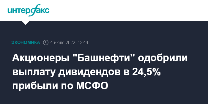 Москва. 4 июля. INTERFAX.RU - Акционеры "Башнефти" на годовом собрании одобрили выплату дивидендов за 2021 год в 117,29 рублей на обыкновенную и привилегированную акции, сообщила компании. Дата, на которую определяются лица, имеющие право на получение дивидендов, - 11 июля 2022 года.