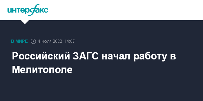 Москва. 4 июля. INTERFAX.RU - Российский ЗАГС начал в понедельник работать в Мелитополе Запорожской области, сообщается на сайте Министерства юстиции РФ.