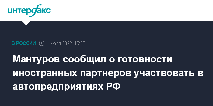 Москва. 4 июля. INTERFAX.RU - Ряд иностранных партнеров готовы в разных форматах участвовать в российских автопредприятиях, сообщил глава Минпромторга Денис Мантуров на пленарной сессии выставки "Иннопром-2022".