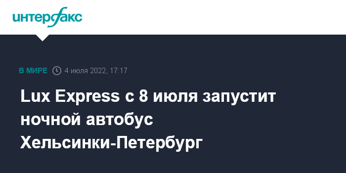Москва. 4 июля. INTERFAX.RU - Международный перевозчик Lux Express с 8 июля добавит ночной автобусный рейс по маршруту Хельсинки-Петербург, сообщила компания во "ВКонтакте".