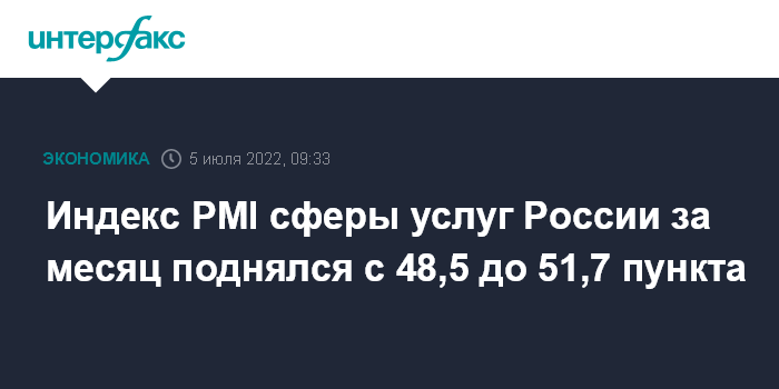 Москва. 5 июля. INTERFAX.RU - Индекс PMI сферы услуг России в июне 2022 года составил 51,7 пункта, поднявшись с майского значения 48,5 пункта, свидетельствуют материалы исследования S&P Global.