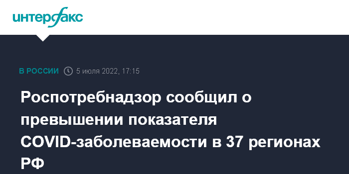 Москва. 5 июля. INTERFAX.RU - Превышение среднероссийского показателя заболеваемости коронавирусом зарегистрировано в 37 регионах РФ, сообщили в Роспотребнадзоре.