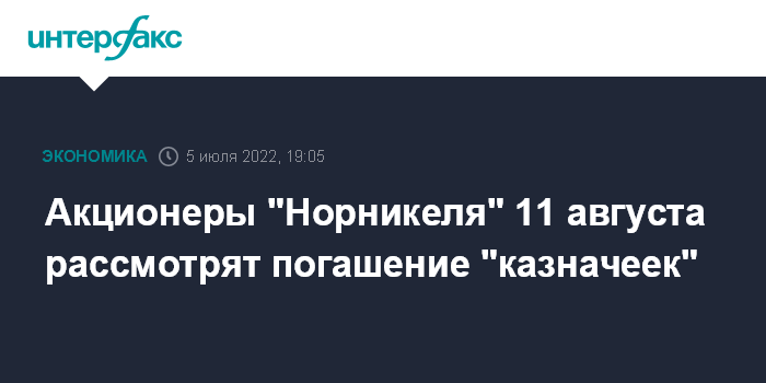 Москва. 5 июля. INTERFAX.RU - Акционеры "Норникеля" на внеочередном собрании 11 августа рассмотрят уменьшение уставного капитала путем погашения казначейских акций, сообщила компания.