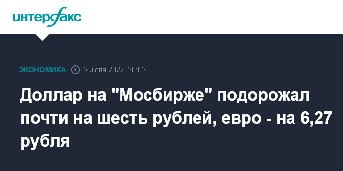 На основе данных "Московской биржи" о средневзвешенных курсах доллара и евро к рублю по сделкам, заключенным с 10:00 до 15:30, Банк России повысилподнял официальный курс доллара на 6 июля на 3,426 рубля, до 58,5118 рубля/$1, и увеличил курс евро на 2,9782 рубля, до 60,1618 рубля за евро.