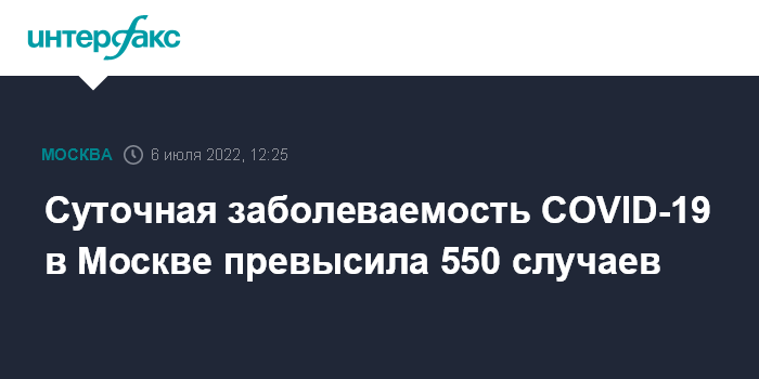 Москва. 6 июля. INTERFAX.RU - Примерно на 65% выросла суточная заболеваемость COVID-19 в Москве, показатель впервые за срок более месяца превысил 550 случаев, следует из данных портала "Стопкоронавирус.рф".