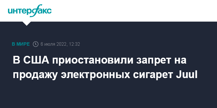 Москва. 6 июля. INTERFAX.RU - Управление по санитарному надзору за качеством пищевых продуктов и медикаментов США (FDA) приостановило запрет на продажу продукции американского производителя электронных сигарет Juul Labs Inc., введенный 23 июня.