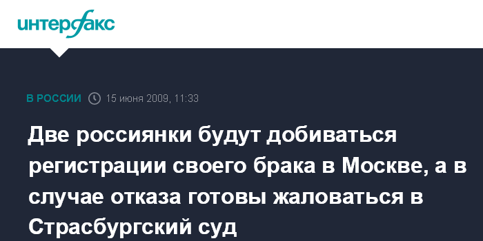Москва. 15 июня. INTERFAX.RU – Лесбийская пара из России обжаловала в Тверском суде Москвы отказ зарегистрировать их брак, заявляют активисты организации сексуальных меньшинств.