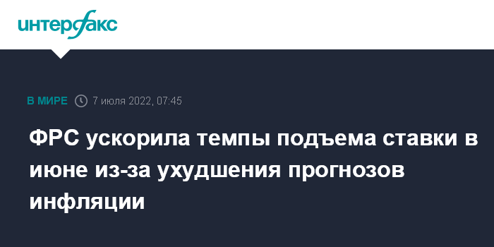 Москва. 7 июля. INTERFAX.RU - Руководители Федеральной резервной системы (ФРС) посчитали нужным ускорить темпы повышения базовой процентной ставки в связи с ухудшением инфляционных прогнозов и сошлись во мнении о необходимости ее подъема до уровней, при которых политика Федрезерва будет ограничивать экономическую активность в США, свидетельствует протокол прошедшего 14-15 июня заседания Федерального комитета по операциям на открытом рынке (FOMC).