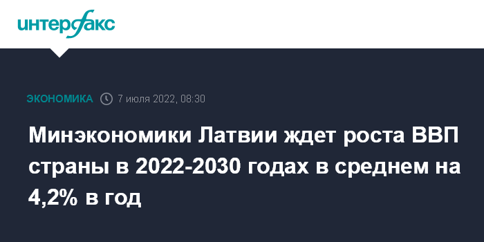 Москва. 7 июля. INTERFAX.RU -Министерство экономики Латвии прогнозирует экономический рост страны в 2022-2030 годах в среднем на уровне 4,2% в год, а в период 2031-2040 гг - в среднем на 3% в год, говорится в докладе ведомства о среднесрочных и долгосрочных прогнозах рынка труда.
