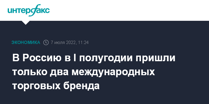 Москва. 7 июля. INTERFAX.RU - В первом полугодии 2022 года на российский рынок пришли только два международных бренда, сообщила консалтинговая компания Knight Frank Russia.