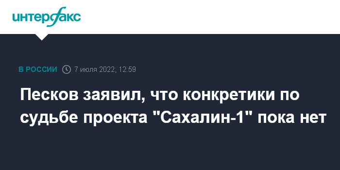 Москва. 7 июля. INTERFAX.RU - В случае с проектом "Сахалин-1" таких же решений, как по "Сахалин-2", пока нет, заявил пресс-секретарь президента РФ Дмитрий Песков.
