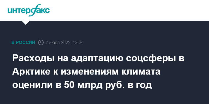 Москва. 7 июля. INTERFAX.RU - Инвестиции в адаптацию объектов социальной сферы РФ, расположенных в арктической зоне, к изменениям климата оцениваются в 50 млрд рублей в год. Об этом сообщил научный руководитель Института народнохозяйственного прогнозирования РАН Борис Порфирьев.