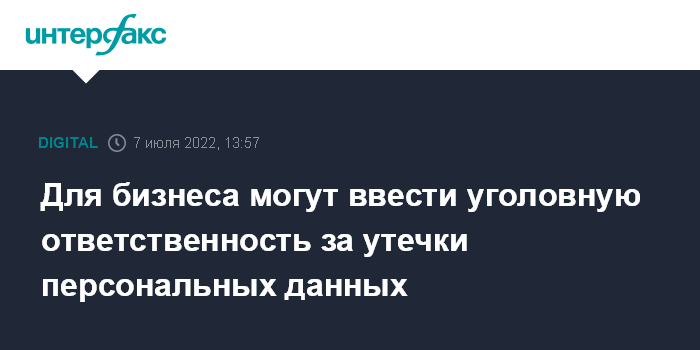 Москва. 7 июля. INTERFAX.RU - Минцифры РФ разрабатывает законопроект, предусматривающий уголовную ответственность для представителей бизнеса за тяжкие последствия утечек персональных данных, сообщил "Интерфаксу" глава комитета Госдумы по информационной политике, информационным технологиям и связи Александр Хинштейн.