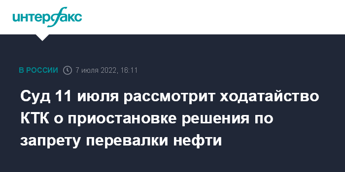 Москва. 7 июля. INTERFAX.RU - Краснодарский краевой суд 11 июля рассмотрит ходатайство "Каспийского трубопроводного консорциума" (КТК) о приостановке решения о запрете деятельности по перевалке нефти, заявили журналистам в пресс-службе КТК.